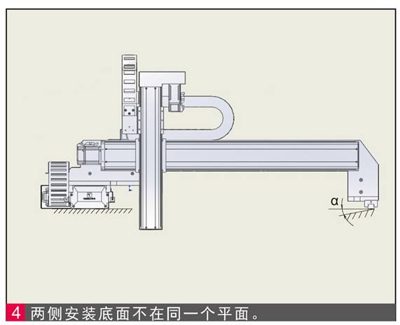 机械手臂采用龙门式安装时,如果两边的导轨高度不平,或者平行两滑台不平行,将会使电动滑台憋住,加速电动滑台的损坏。