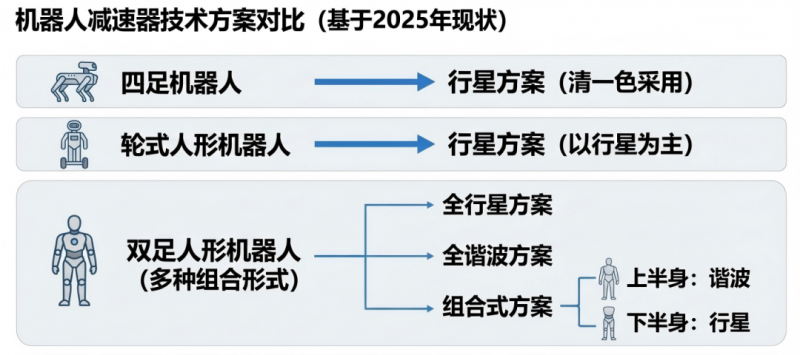 从实际出货结构来看,不同机器人形态对关节方案的选择已经出现分化。四足机器人几乎清一色采用行星方案;轮式人形机器人同样以行星为主;在双足人形上,则存在多种组合形式——有的采用行星方案,有的采用谐波方案,有的在上半身使用谐波、下半身使用行星。相比之下,RV减速器由于传动效率偏低、发热问题突出,目前并未发现在人形机器人上有成熟的方案。