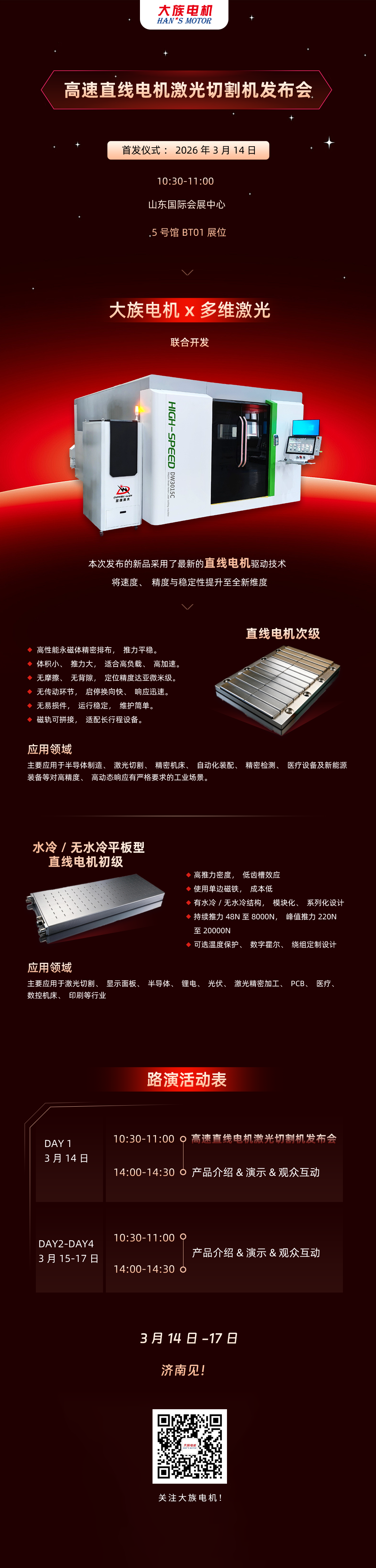 2026年3月14日,山东国际会展中心将迎来一场行业盛会——由大族电机与多维激光联合开发的高速直线电机激光切割机将举行首发仪式,活动将在多维激光展位(5号馆 BT01)隆重开启!诚邀共鉴技术革新。本次发布的新品采用最新直线电机驱动技术,突破传统传动限制,将速度、精度与稳定性提升至全新维度