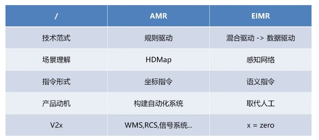 他清晰地划定了二者的本质边界。AMR是规则驱动,依赖高精度地图,执行的是坐标指令,本质是在构建一套自动化系统;而EIMR走向数据驱动或混合驱动,走“重感知、轻地图”的感知网络路线,靠语义指令运行,产品动机朴素得多——就是取代人工。放在车联网的语境下,AMR离不开WMS、RCS这些上层系统;而EIMR的目标,是把V2X里的那个“X”彻底拿掉,实现X=ZERO的单机自主。