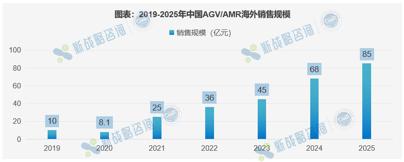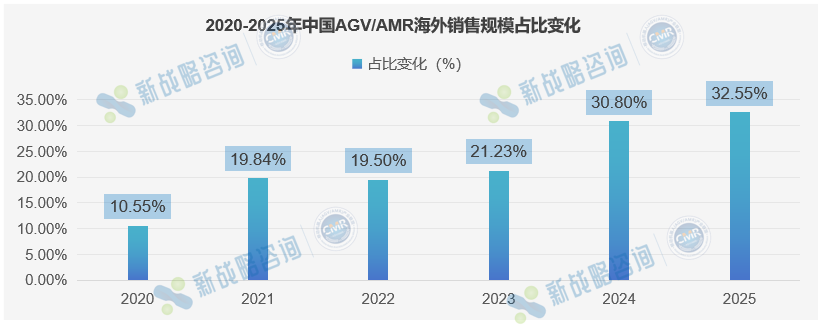 根据CMR产业联盟数据,新战略移动机器人产业研究所统计,2025年,中国AGV/AMR企业海外销售规模为85亿,同比增长25%。在整体市场规模中占比为32.55%。