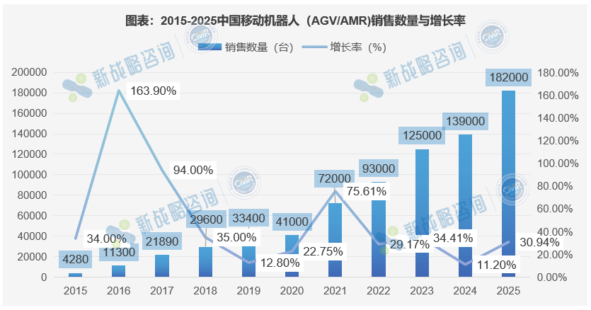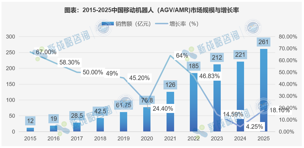 根据CMR产业联盟数据、新战略移动机器人产业研究所统计,2025年中国移动机器人(AGV/AMR)市场销售规模为261亿元,同比增长18.10%,销售数量18.2万台,同比增长30.94%。