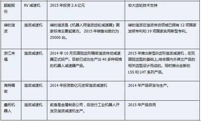 工业机器人减速机生产企业主要是日本公司,纳博特斯克、哈默纳科、住友是其中的主要代表公司,现在纳博特斯克公司由帝人制机株式会社和纳博克株式会社于2003 年合并组成。纳博特斯克和哈默纳科两家公司占据工业机器人七成以上的减速机市场,纳博特斯克优势产品是RV 减速机,哈默纳科的优势产品是谐波减速机。其中日本纳博是一家从事尖端核心部件的跨国企业,主要从事静液压驱动装置、液压装置、减速装置及其部件的研发、制造。自1985 年发明至今,日本纳博的精密减速机累计已向全球销售400 万台,2014年销售额达442 亿日元(约合人民币30 亿),营业利润达80 亿日元(约合人民币6 亿)。日本纳博精密减速机扭矩大且精度高,高刚性且抗震性强,尤其产品质量保障期超长(根据不同应用领域环境从50 年-100 年),成为全球汽车工业机器人制造商的独家选择。20 多年来,日本纳博精密减速机全球市场占有率稳居60%,持续保持世界第一。其次是韩国的减速机,韩国减速机一直以来用于军用,前些年在工业机器人市场很少推广,近两年开始大力在工业机器人推广,以SEJINIGB、韩中减速机等为例。