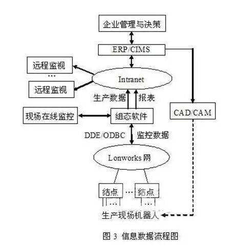 为满足企业信息化管理的需要,可在插有Lonworks网卡的控制网监控主机的内部另外再插一块TCP/IP的企业内部Intranet网卡,利用FIX或其它组态软件实现企业管理中的生产数据共享。各相关的被授权部门则可通过企业内部网,根据各自的访问权限对生产过程进行远程监视。此外,组态软件还具备有自动生成报表的功能,可生成全厂和各车间的各类报表,各类信息数据都能直接提供给企业的管理人员,并在此基础上构建CIMS或ERP等形式的企业信息化管理系统,用以支持全厂和各车间管理与决策,其数据流向方式如图3所示。