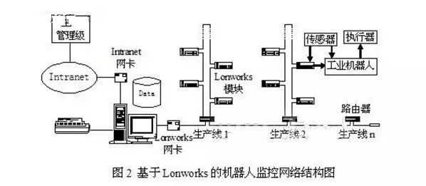 图2是一个制造业生产中应用LonWorks现场总线技术实现机器人联网监控的方案。系统中主干网采用总线式结构,将厂区内各车间与办公楼中的核心监控主机相连;各子网分布于车间内部,均采用环形结构,从而有效地克服网络断线故障带来的影响。每个子网都通过一个相应路由器连接到主干网上,实现与控制网络主机之间的通信。不同监控对象所用的传感器和执行器类型不同,且分散分布于全厂各处,如采用一般的集散控制方式,很难将之连接在同一系统中,而Lonworks技术的开放性则能很容易地解决这一问题。生产加工中的各种监测信号分为两路,所获得的两组信号,一组连接在现场的机器人控制器内,实现相对独立的局部控制。另一组监测信号以及生产线上各机器人的控制信号则连接到分布于各车间的智能模块的I/O口上,通过现场总线实现数据的网络传输,以实现对机器人的现场控制与网络遥操作相结合的监控体系。这样,当生产线中出现异常情况时,通过控制网络即可实现对多个机器人之间的工作协调,并进行异常情况的紧急处理;而当现场总线网络出现故障时,相对独立的机器人系统仍然可以正常地工作。