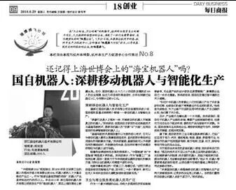 空格“中国制造2025”规划指出,到2020年自主品牌工业机器人的国内市场占有率要达到50%,机器人被列入十大重点推动产业之一。作为“制造业皇冠顶端的明珠”,机器人产业显然站在时代的风口上。早在2010年,浙江国自机器人技术有限公司研发生产的“海宝机器人”,就在上海世博会上崭露头角。如今,国自机器人从十几个人的团队发展到近300人的企业规模,经过几年连续的高速成长,去年合同额已经超过1亿,今年预计达到3亿元。